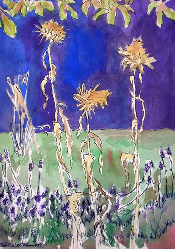 Autumn Artichokes, line and wash, executed en plein air at Bannockburn Farm, Mt. Newton Valley. Matted 8x10 conservation print available,$50.
